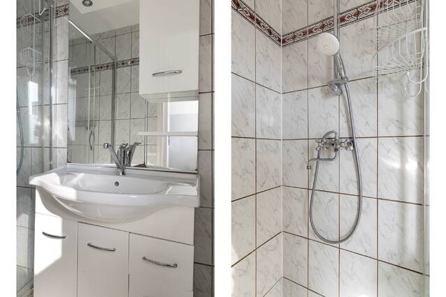 De keuken is praktisch ingedeeld in een rechte opstelling en uitgerust met diverse inbouwapparatuur, waaronder een inductiekookplaat, afzuigkap, oven en koel-vriescombinatie. Vanuit de keuken is er toegang tot de badkamer met douche, wastafel en aansluiting voor de wasmachine.