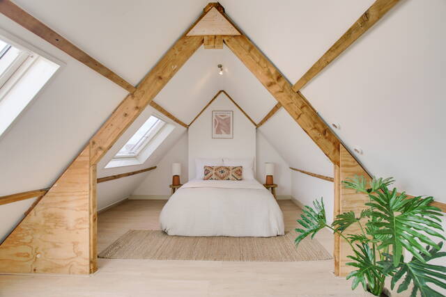 Wat een ruimte! Deze sfeervolle zolderkamer met een nokhoogte van 2.46 m is afgewerkt met houten balken, twee dakramen en voldoende plek voor een tweepersoonsbed én opbergruimte. Perfect als tweede slaapkamer, werkkamer of logeerplek.