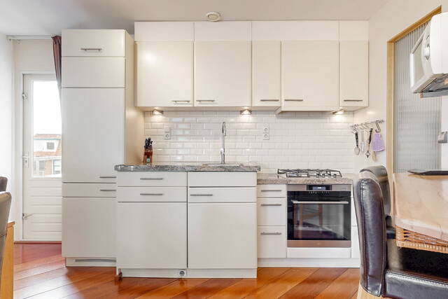 De open keuken heeft een natuurstenen aanrechtblad en is uiteraard voorzien van diverse (inbouw) apparatuur zoals een oven, vaatwasser, 4 pits gasfornuis met afzuigkap en een koelkast. Bij de keuken is een gezellig (ontbijt)barretje gecreëerd, leuk om te ontbijten of even een kopje koffie te nuttigen.