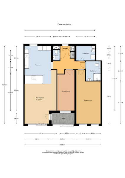 Vanuit de woonkamer is het gezellige balkon/loggia bereikbaar. Daarnaast bevinden zich de twee royale slaapkamers waarvan er één zo ruim is dat daar, naast het slaapgedeelte, bijvoorbeeld ook nog een werkplek of kleedruimte kan worden gecreëerd. De ruime moderne badkamer beschikt over een inloopdouche, een wastafel/spiegel, mechanische ventilatie, een toilet en een designradiator. In de hal bevindt zich nog een separaat toilet met fonteintje. Ook is er nog een inpandige berging/technische ruimte waarin, naast extra bergruimte, de technische installatie zich bevindt voor de WTW en de wasopstelling.