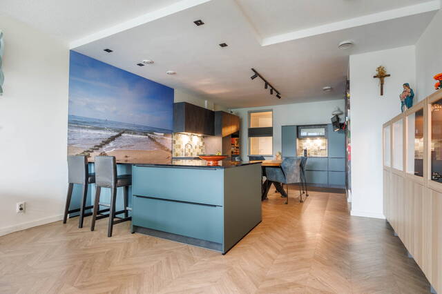 Ruime hal met een gezellige nis met zitje en toegang tot alle ruimtes. De ruime woonkamer heeft een open grote luxe woonkeuken met kook(schier)eiland met zitje en diverse inbouwapparatuur zoals o.a. een inductiekookplaat met ingebouwde afzuiging, oven, magnetron, vaatwasser en grote koelkast. De sfeervolle keuken bestaat uit drie delen, een kookeiland, een deel met spoelbak en een deel met een gezellige koffiecorner. Meer dan voldoende werk- en opbergruimte dus!