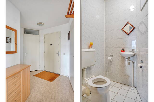 Here you’ll find the apartment. Upon entering, a spacious hallway provides access to all rooms. In the hall, you’ll find the meter cupboard, a small storage area, and a separate toilet with washbasin.