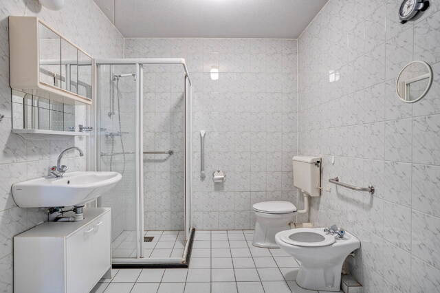 The bathroom is generous in size and fully tiled in a neutral style. It features a shower cabin, washbasin unit, toilet, and bidet. The washing machine connection is also located here.