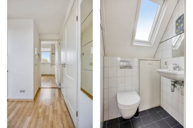 De entree biedt toegang tot de hal van het appartement, vanwaar u alle vertrekken bereikt. De woonkamer met open keuken is licht en sfeervol dankzij de grote dakramen en schuine plafonds, die het appartement een uniek karakter geven.