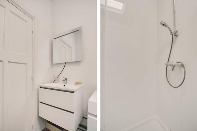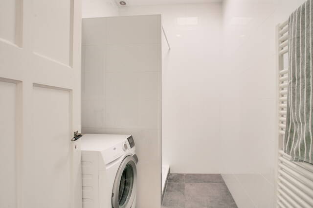 • Nette badkamer met douche, wastafel, wasmachineaansluiting en designradiator.