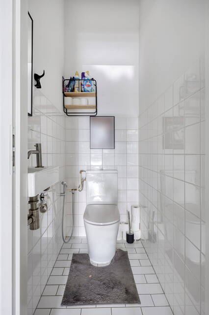The bathroom features a shower, sink with cabinet, additional storage space and a washing machine. There is also a separate toilet with a small sink.