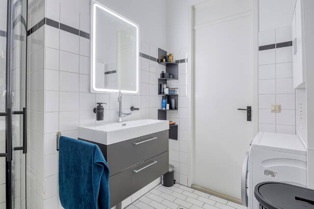 De badkamer beschikt over een douche, wastafel met meubel, extra kastruimte en een wasmachine. Daarnaast is er een apart toilet met fonteintje.