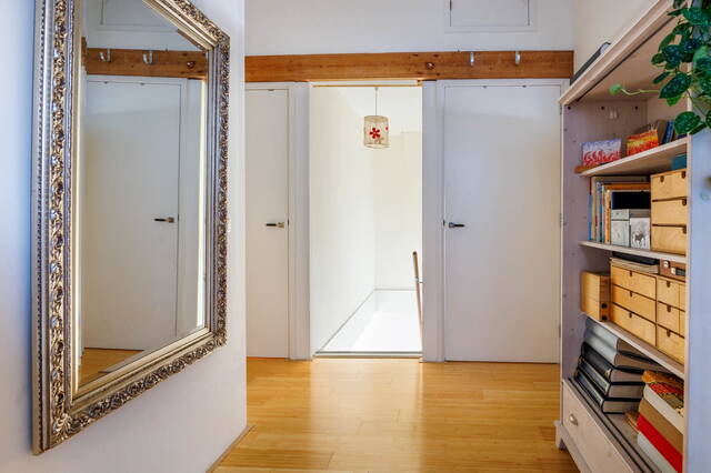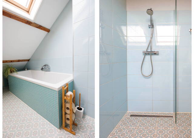 The modern second bathroom is very spacious and includes two washbasins, a bathtub, a walk-in shower, a toilet, and a connection for a dryer. Both this bathroom and the first one (plus the separate toilet) are finished in tasteful colors with elegant floor tiles. From the landing, there is access to a large attic for even more storage space.