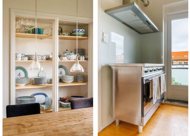 The spacious kitchen is located at the rear and includes a large dining area. The bright kitchen is equipped with an induction stove, extractor hood, dishwasher, and plenty of cupboard space. From both the dining area and kitchen, you have a lovely view of the beautiful courtyard garden and access to the rear balcony, where the washing machine connection is also located.