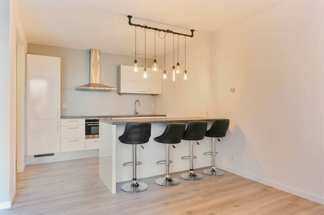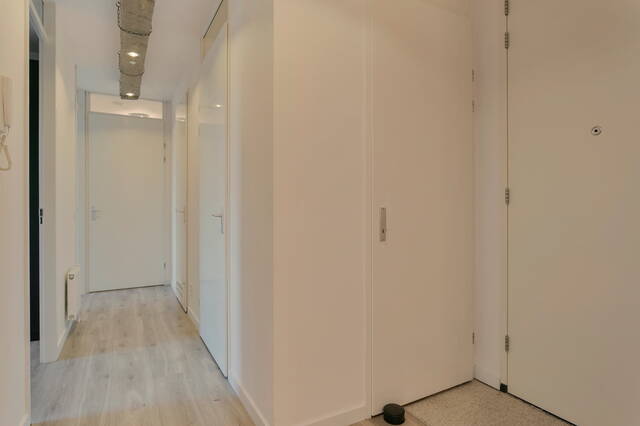 2de verdieping: Entree met hal. Twee lichte slaapkamers. Luxe badkamer met inloopdouche, glazen douchewand, designradiator, wastafel in meubel en spiegel met ingebouwde verlichting. Technische ruimte met opstelling warmte terugwininstallatie en wasmachine aansluiting. Apart toilet met fontein. Ruime en lichte woonkamer met toegang tot het zonnige balkon. Moderne open keuken voorzien van bar-opstelling, vaatwasser, keramische kookplaat, afzuigkap, koel/-vriescombinatie en een combi-oven. Het appartement is volledig voorzien van een keurige laminaatvloer.
