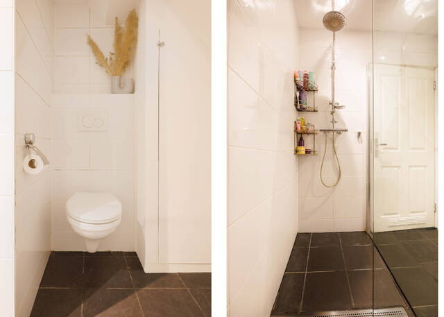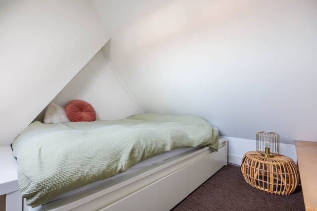 Long landing giving access to the three bedrooms and the bathroom. Two cosy bedrooms with a rear dormer, each with a washbasin unit with mirror, and stairs leading to a mezzanine with a window, currently used as a sleeping area. There is also a spacious and sunny bedroom at the front with a dormer and a washbasin unit with mirror. The generous bathroom features a walk-in shower with glass screen, a toilet, radiator, and mechanical ventilation. The washing machine and dryer connections are also located here.