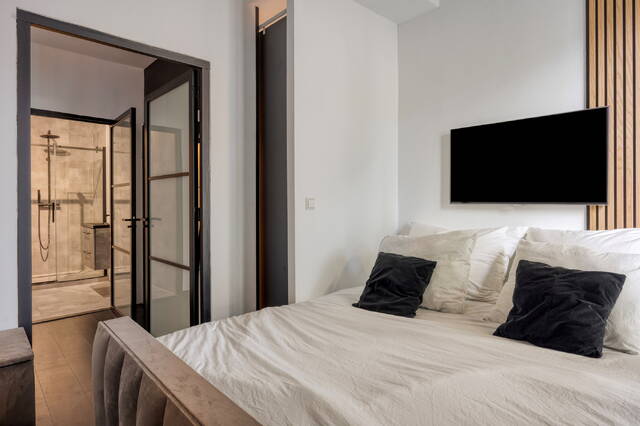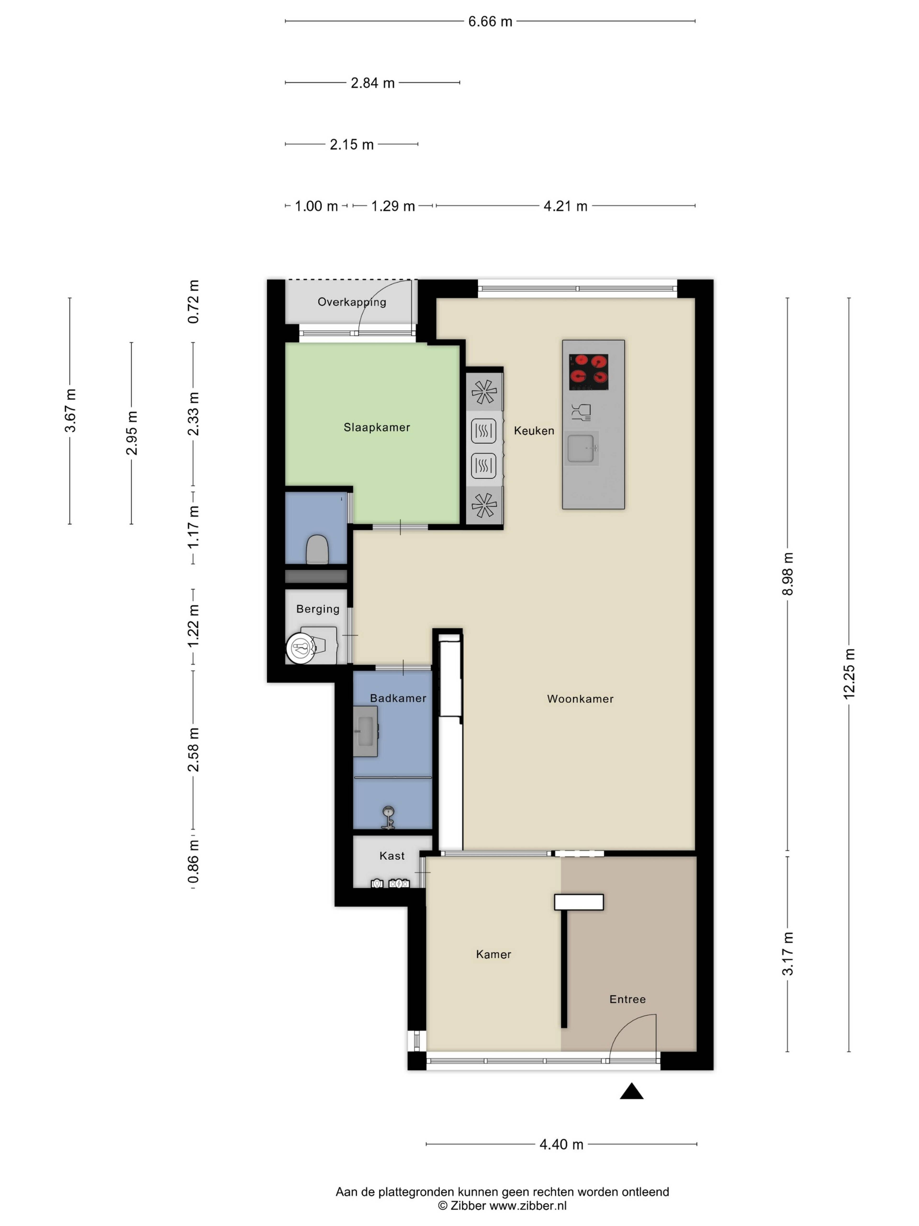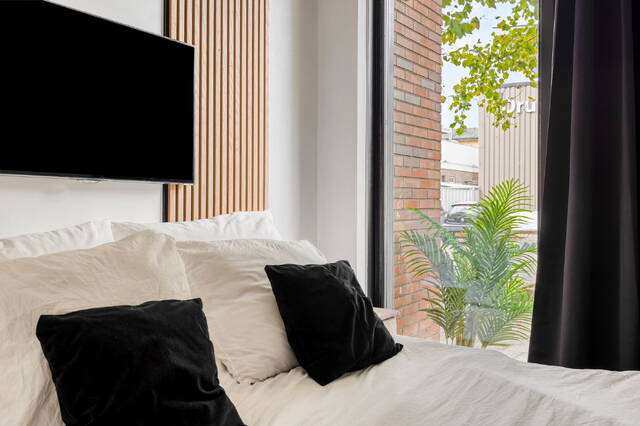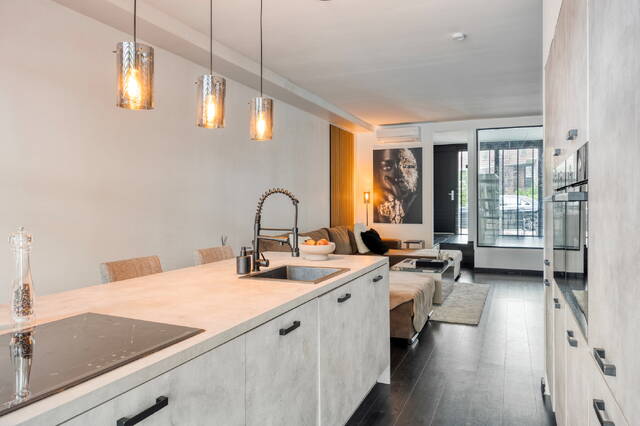 Via de entree kom je binnen in een ruime hal die toegang geeft tot een werkkamer (welke omgebouwd kan worden tot een tweede slaapkamer) en woonkamer. De lichte en royale woonkamer vormt het hart van de woning en biedt volop ruimte voor zowel een zit- als eetgedeelte. De moderne open keuken is uitgerust met een kookeiland en voorzien van alle nodige inbouwapparatuur, ideaal voor kookliefhebbers.