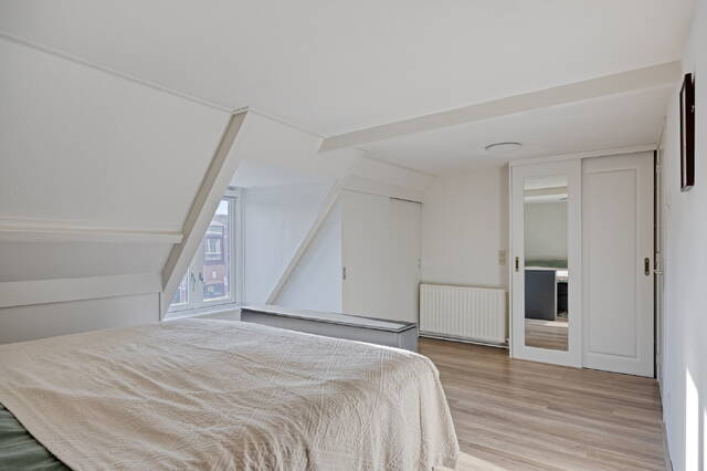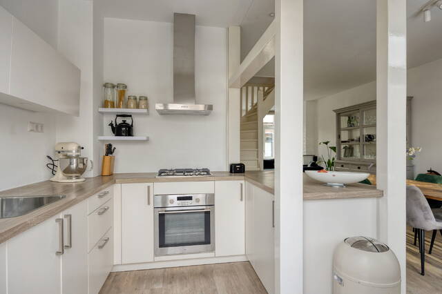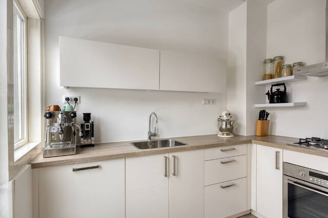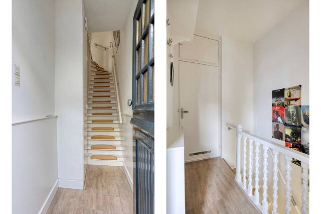 De overloop geeft toegang tot het gemoderniseerde toilet met fonteintje, uitgevoerd in dezelfde stijlvolle afwerking als de badkamer. Aan de voorzijde bevindt zich de eerste slaapkamer, die dankzij de prettige lichtinval ook uitstekend geschikt is als werkkamer. De lichte woonkamer vormt het hart van de woning. Het hoge plafond en de originele schouwen zijn echte blikvangers en geven de ruimte karakter. De woonkamer loopt naadloos over in de moderne keuken aan de achterzijde, voorzien van een gaskookplaat, vaatwasser, koelkast en afzuigkap.