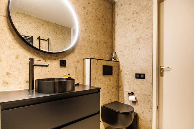 The luxurious bathroom, also renovated in 2023, includes a spacious walk-in shower with rain shower, a modern vanity unit with illuminated and heated round mirror, a second toilet (with bidet function), and a designer radiator. Both the bathroom and the separate toilet are fully tiled in beautiful natural stone, enhancing the high-end and luxurious appearance.