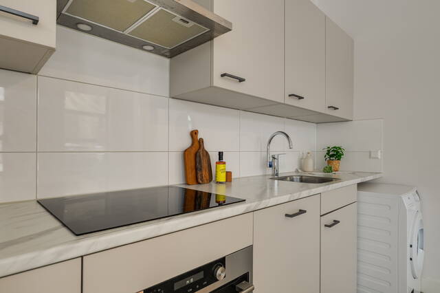 De moderne open keuken is strak uitgevoerd en voorzien van inbouwapparatuur, waaronder een vaatwasser, oven en inductiekookplaat. Daarnaast is er voldoende werk- en bergruimte, ideaal voor dagelijks gebruik. De wasmachineopstelling bevindt zich eveneens in de keuken.