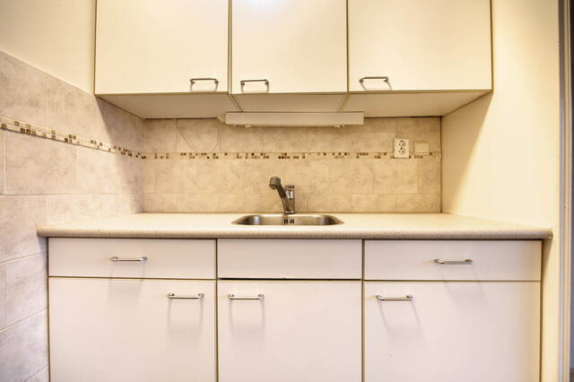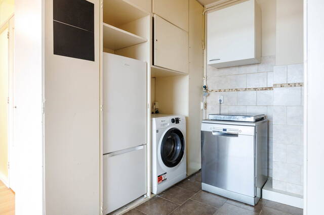 Adjacent is the open kitchen, featuring a tiled floor and ample cupboard space. The washing machine connection is also located here.