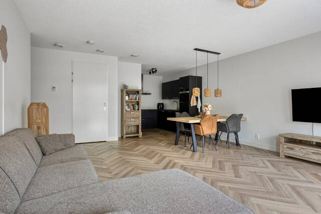 Het appartement is gelegen op de derde verdieping en biedt een royale woonoppervlakte met een prettige, lichte indeling. De woonkamer vormt samen met de open keuken het hart van de woning. De keuken is modern en luxe uitgevoerd en voorzien van complete inbouwapparatuur, waaronder een inductiekookplaat, oven, magnetron, vaatwasser en een ruime koel-vriescombinatie. De stijlvolle pvc-visgraatvloer in combinatie met vloerverwarming en -koeling zorgt voor optimaal wooncomfort in elk seizoen.