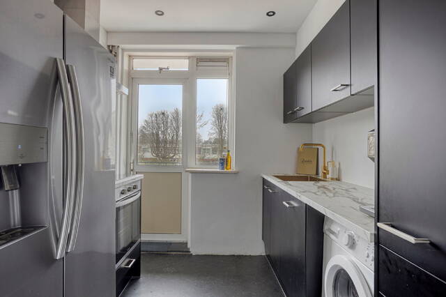 De moderne keuken is uitgerust met een lichte, rechte keukenopstelling, voorzien van een 4-pits inductiekookplaat, een vaatwasser, een grote koel-vriescombinatie en diverse kasten voor extra opbergruimte. Hier bevindt zich ook de aansluiting voor de wasmachine. Vanuit de keuken heeft u toegang tot het balkon aan de voorzijde.
