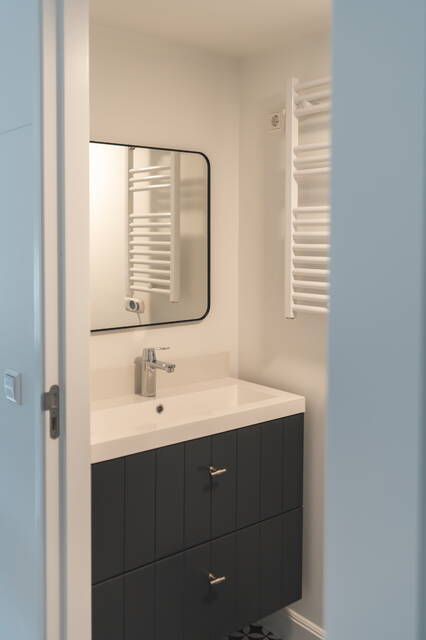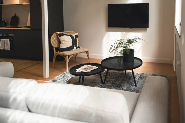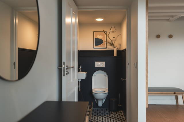 Via de eigen entree stap je de ruime woonkamer binnen. Dankzij de plafondhoogte en de grote raampartijen voelt het hier licht en open aan. Aan de voorzijde bevindt zich de nette open keuken, voorzien van modern keukenblok en inbouwapparatuur. Aangrenzend een separaat toilet – praktisch en gastvriendelijk.