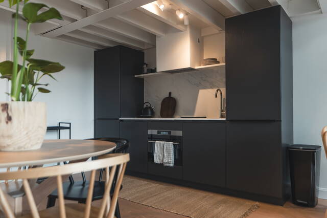 De open keuken is stijlvol vormgegeven met strakke matzwarte fronten en volledig nieuwe inbouwapparatuur (inductiekookplaat, afzuigkap, oven, koelkast, vriezer en vaatwasser). De warme houten vloer maakt het helemaal af.