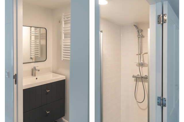 De open trap leidt naar de bovenverdieping met uitzicht op de woonruimte. Hier bevindt zich de slaapkamer, inclusief een compacte, goed ingedeelde badkamer met douche en wastafel. Plafondhoogte op deze verdieping is circa 2,40 meter.