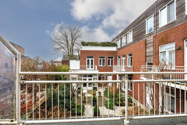 Vanuit de woonkamer is het royale, overdekte balkon op het zuiden bereikbaar, met voldoende ruimte voor een comfortabele zithoek en een fraai uitzicht over de buitenring van Leiden.