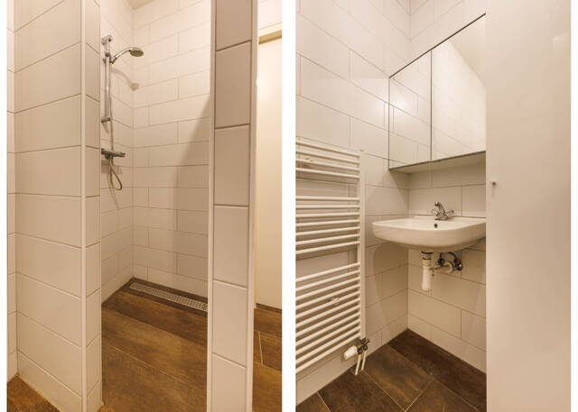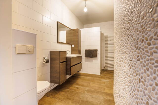 De tweede badkamer beschikt over een tweede toilet, een wastafelmeubel met kasten, een inloopdouche en een handdoekenradiator. Beide badkamers zijn modern en volledig betegeld.
