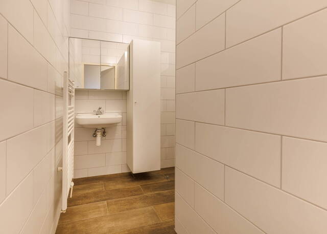 Naast de masterbedroom bevindt zich de tweede slaapkamer, die momenteel in gebruik is als werkkamer, maar ook uitstekend geschikt is als slaapkamer. De eerste badkamer is voorzien van een inloopdouche, wastafel, handdoekenradiator en een opbergkast voor handdoeken. Vanuit deze badkamer is er toegang tot de inpandige berging met aansluiting voor de wasmachine en de cv-ketel. Het toilet is separaat.