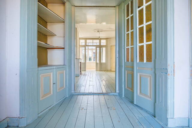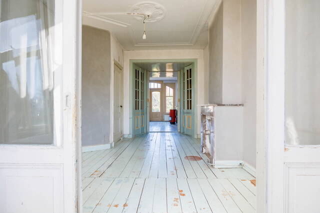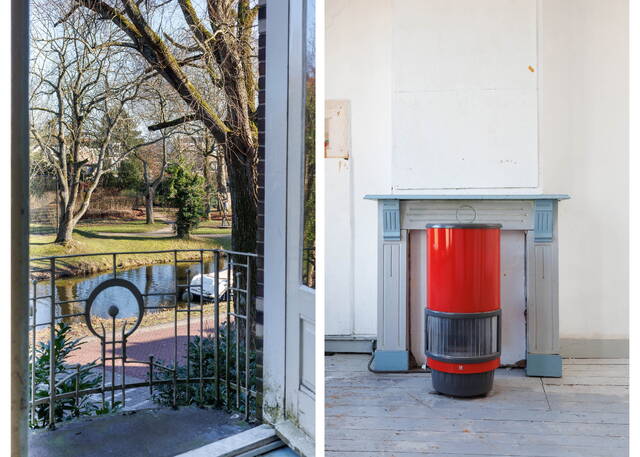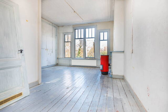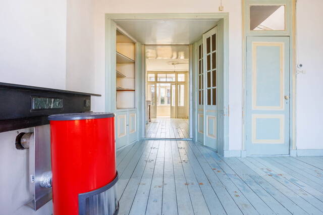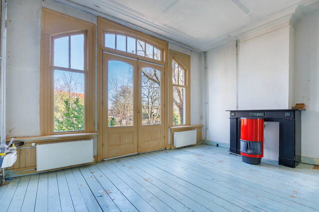 Landing with access to the living room, dining room, toilet, and a large built-in storage cupboard. The generous and bright living room at the front is characterized by beautiful authentic high windows, high ceilings, and an attractive fireplace mantel. French doors open onto the rounded balcony with original railings, where you can fully enjoy the lovely views of the green surroundings and the water.