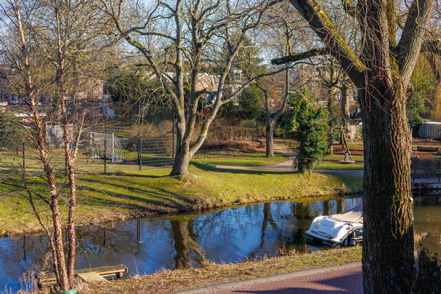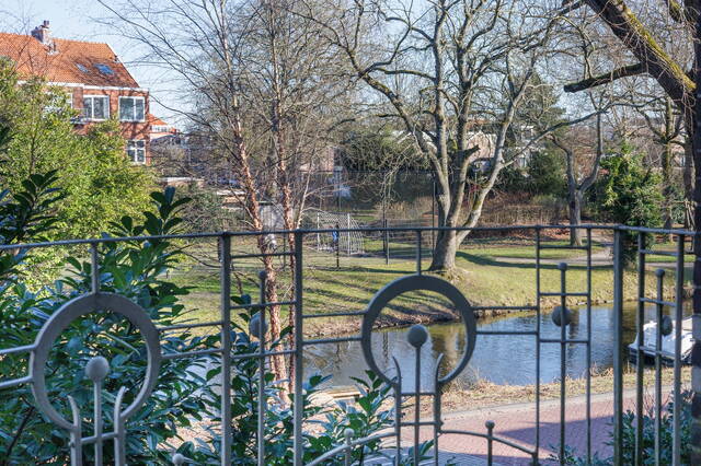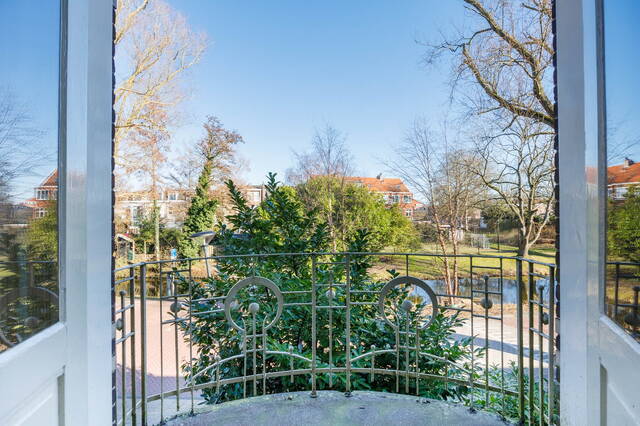 Aan de achterzijde bevindt zich nog een (slaap)kamer met een originele schouw. Via openslaande deuren is er toegang tot het royale balkon/dakterras, waar je heerlijk kunt genieten van de middag- en avondzon en het fraaie uitzicht.