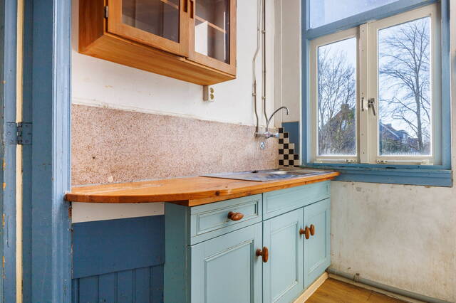 De woonkamer staat middels dubbele en-suitedeuren, voorzien van meerdere vaste originele kasten, in verbinding met het tweede gedeelte van de woonkamer. Hier is eenvoudig een fraaie eetkamer te realiseren. Vanuit deze ruimte geven de en-suitedeuren toegang tot een extra kamer/serre met uitzicht op de groene omgeving. De gesloten keuken bevindt zich eveneens aan de achterzijde van de woning.