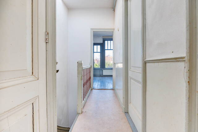 Spacious and bright landing with a skylight, providing access through two doors to a very large and sunny (bed)room at the front (formerly two rooms). Here too, the high ceilings and large windows create wonderful natural light. The room also features a characteristic fireplace mantel with stove and an additional skylight.