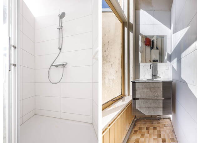 At the rear, there is another (bed)room with an original fireplace mantel. French doors provide access to the generous balcony/roof terrace, where you can enjoy the afternoon and evening sun and the attractive views.