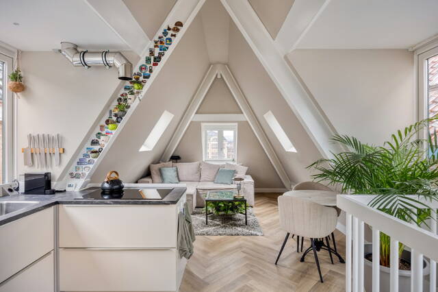 The bright living area features two large dormer windows and offers attractive views over the water and the Beestenmarkt at the front. The open-plan layout creates a light, modern and inviting atmosphere.