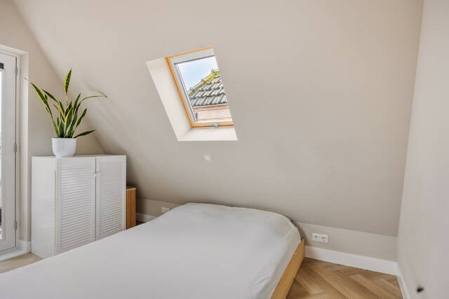 De slaapkamer ligt aan de rustige achterzijde en beschikt over een Frans balkon en twee grote dakramen, wat zorgt voor veel licht en een rustige sfeer.