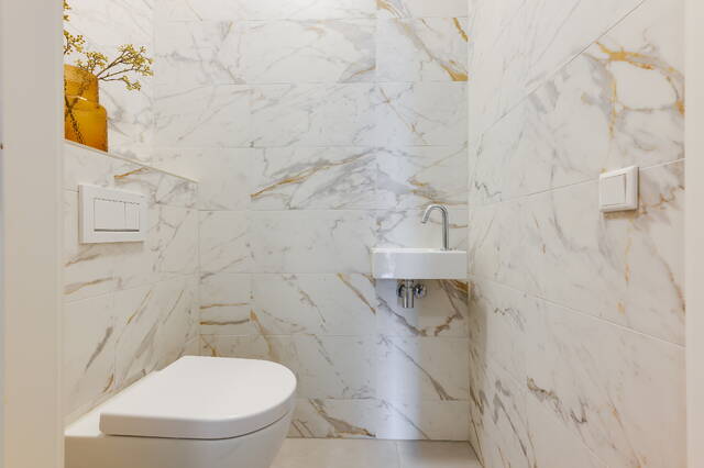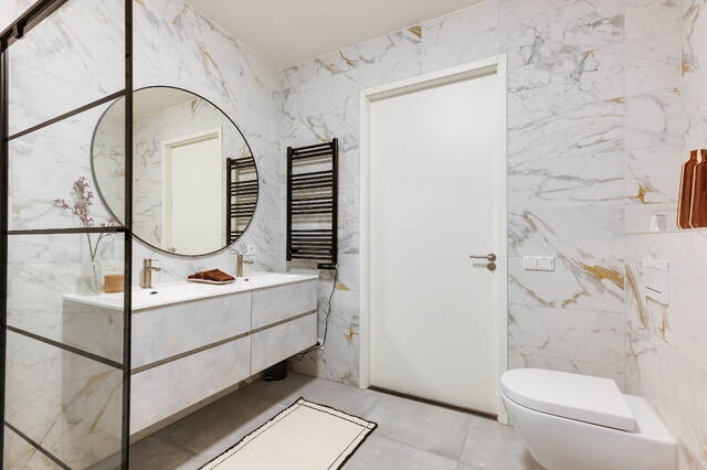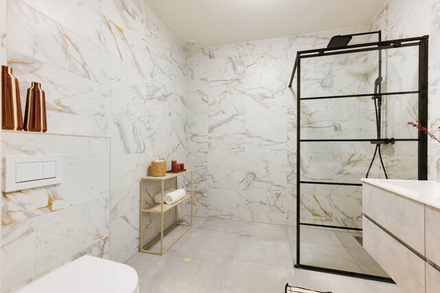 De badkamer is modern uitgevoerd met inloopdouche, een meubel met dubbele wastafels en een hangend toilet. De woning beschikt over comfortabele vloerverwarming en vloerkoeling via de warmtepompinstallatie.