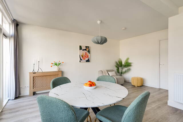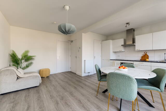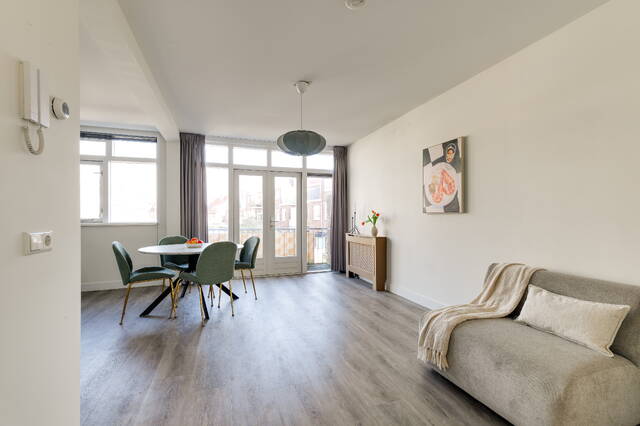 De lichte woonkamer aan de achterzijde heeft grote raampartijen en openslaande deuren naar het balkon. Hierdoor geniet je van veel daglicht en een fijne verbinding met buiten.
