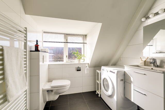 De badkamer (2021) is netjes afgewerkt en beschikt over een inloopdouche, wastafelmeubel, toilet en aansluiting voor de wasmachine.