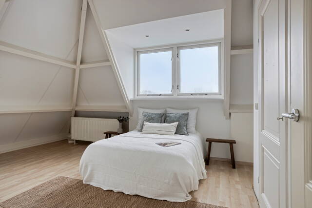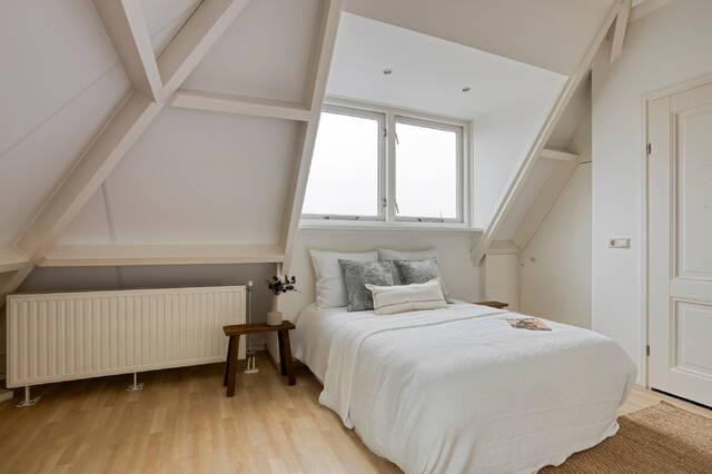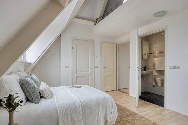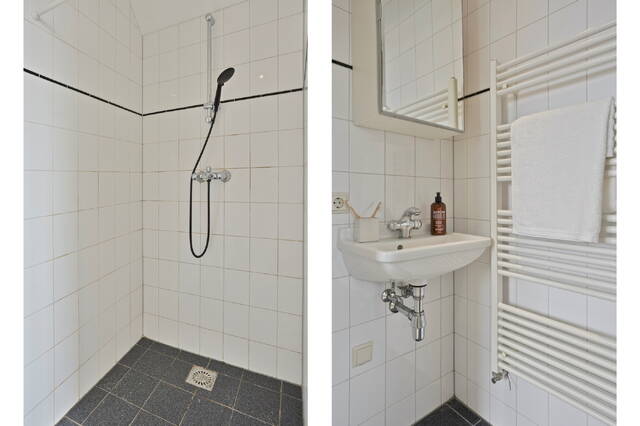 The bedroom is comfortable and quietly located, with beautiful views over the historic rooftops of Leiden. The cozy bathroom features a walk-in shower, sink, and design radiator. In a separate cupboard you will find the central heating system and the washing machine connection, with additional storage space. The toilet is separate and equipped with a small sink.