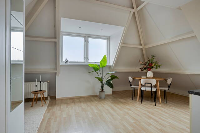 The entrance provides access to the hallway of the apartment, from which all rooms can be reached. The living room with open kitchen is bright and inviting thanks to the large roof windows and sloped ceilings, giving the apartment a unique character.