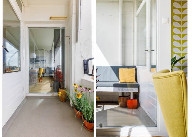 Entrance with enclosed vestibule and a spacious open hall. The large, bright living room offers a separate sitting and dining area. Thanks to the large windows, you have a beautiful view of the park-like surroundings and the canal. The sunny balcony faces southwest, allowing you to enjoy the sun from afternoon until sunset, sheltered from the wind. The entire rear façade is equipped with two electric awnings.