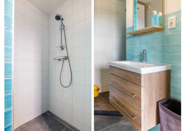 De lichte, moderne keuken is uitgerust met een houten werkblad, charmante groene wandtegeltjes en diverse inbouwapparatuur, waaronder een vaatwasser, combimagnetron/-oven inductiekookplaat, koel-/vriescombinatie en een ingebouwde afzuigkap. Vanuit de keuken is de fraai betegelde badkamer bereikbaar, voorzien van een wastafelmeubel, inloopdouche en de opstelling voor de wasmachine.