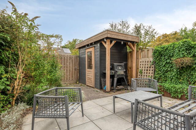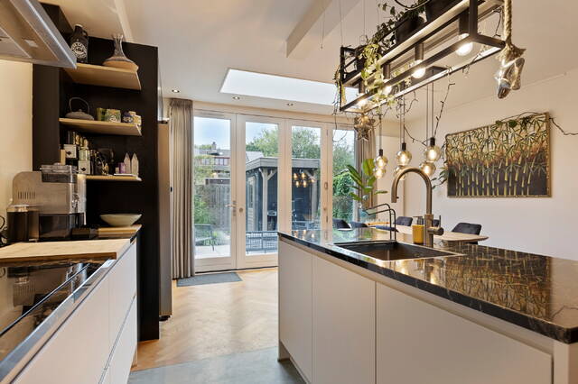 The modern extended open kitchen with cooking island is a dream for any home chef: plenty of cupboards and storage space, a large modern induction hob, dishwasher, American fridge, spacious wine cooler, steam oven, Quooker, and direct access to the garden with detached wooden shed and back entrance.