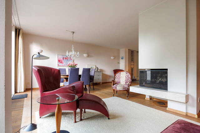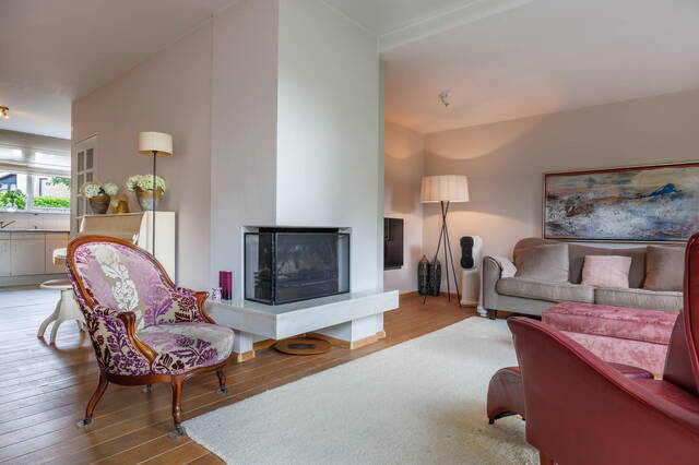 Via the beautifully landscaped front garden, you enter the hallway, which includes a coat area and a toilet with a small sink. From the hallway, you step into the spacious and bright L-shaped living room with a cozy open fireplace and an open-plan kitchen. The room has large windows, letting in plenty of natural light, and a charming side area that also overlooks the garden. Through the sliding doors, you access the generously sized and beautifully landscaped south-facing backyard, where you can enjoy the sun all day long. There is a cozy gazebo, a sunshade, and built-in storage cabinets for extra space.