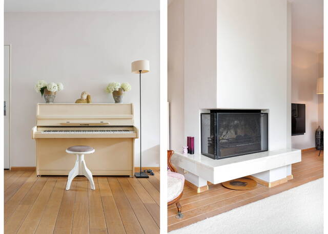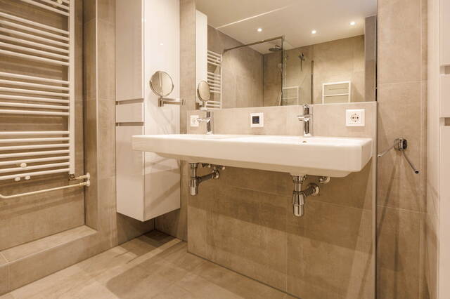 A spacious landing with plenty of daylight thanks to a side window. At the front of the house is a large bedroom with air conditioning and a walk-in closet. At the rear are two spacious and bright rooms that can be used as bedrooms or home offices; one of them also features a washbasin. The modern and luxurious bathroom (2021) is spacious and includes a rain shower, toilet, towel radiator, and double sink vanity with mirror, two floating cabinets, built-in lighting, and mechanical ventilation. The bathroom also houses the washing machine and dryer.