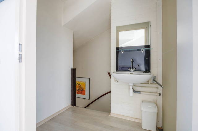 Large landing with a washbasin and additional storage at the rear, featuring a Velux skylight and housing the central heating system and solar water heater. The cozy and bright bedroom has a built-in wardrobe at the front and opens onto a rear balcony with a stunning view over the river Zijl.