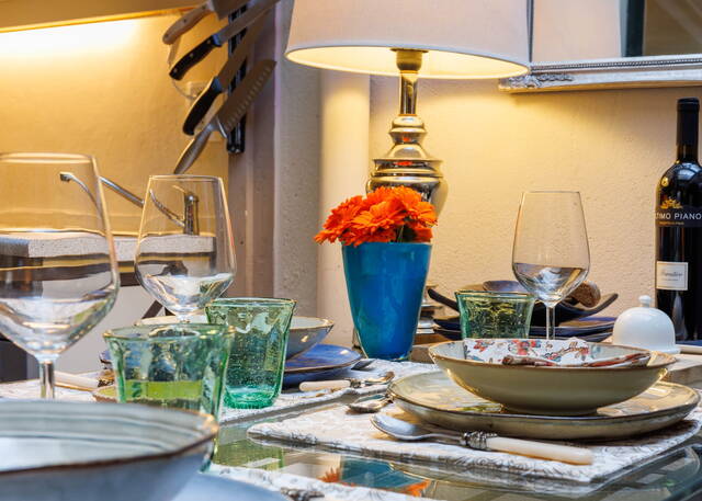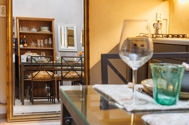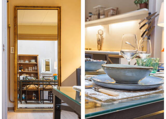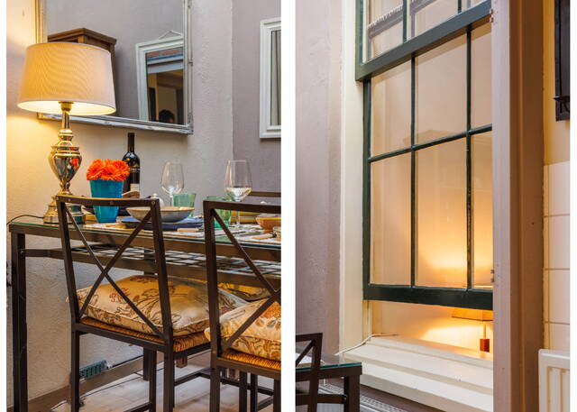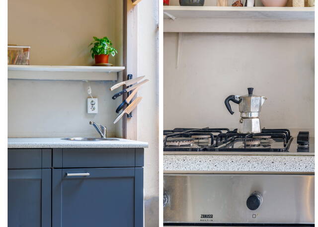 Entrance with direct access to the charming living room, which flows into the cozy kitchen-diner, situated where the courtyard used to be. Thanks to the high windows that remain between the kitchen and living room, this is now a lovely sitting area with lots of daylight. The charming kitchen includes a 4-burner gas stove, a built-in oven, and a (freestanding) microwave.