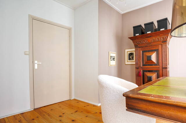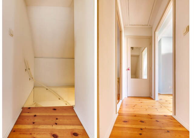Landing with a large built-in wardrobe and access to two charming (bed)rooms. The sunny room at the front has a dormer window, and the cozy room at the back has two skylights. From the landing, a loft ladder provides access to the very spacious attic with lots of extra storage space.
