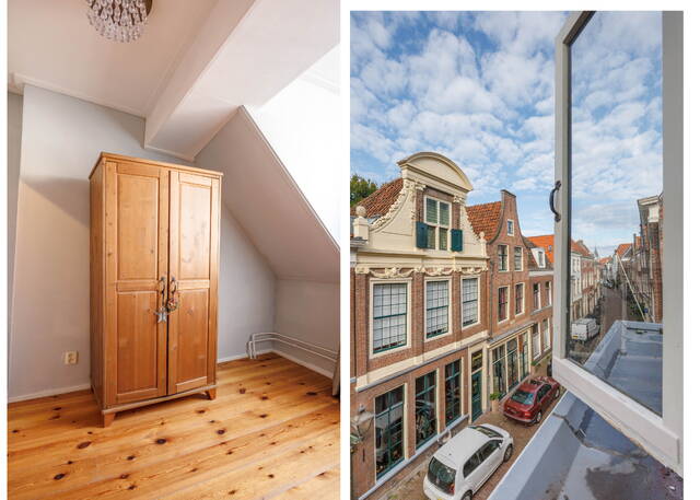 Spacious landing with access to the large (bed)room at the front, the bathroom, and a separate toilet. The bright (bed)room features beautiful large original windows offering a stunning view of the Langebrug with its many historic façades.