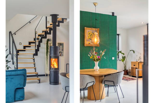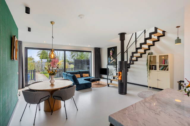 De woonkamer is verrassend ruim en licht, met een grote glazen schuifpui die het binnen- en buitenleven naadloos met elkaar verbindt. De ruimte is speels ingedeeld en biedt een apart gedeelte dat momenteel in gebruik is als kantoor of werkruimte, ideaal voor thuiswerken of als leeshoek. Hier bestaat tevens de mogelijkheid om eenvoudig een derde slaapkamer te creëren. Achterin bevindt zich het tuingerichte zitgedeelte, waar in alle rust van het uitzicht over de tuin, het groen en het water kan worden genoten. Dit gedeelte staat in open verbinding met de rest van de woonkamer en de sfeervolle draaibare houtkachel, die vanuit verschillende hoeken van de kamer te bewonderen is en zorgt voor een warme, uitnodigende sfeer. De stalen trap met frakéhouten treden sluit hier prachtig op aan en vormt een stijlvolle eyecatcher in het interieur.